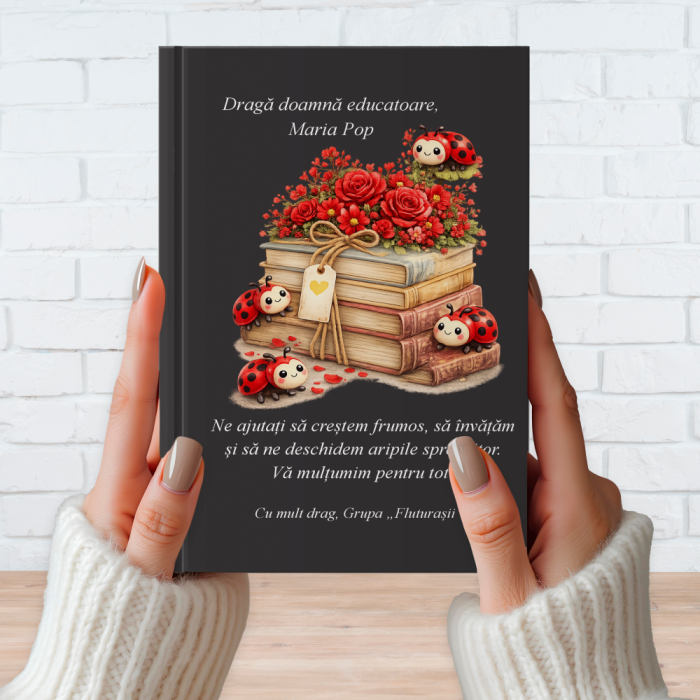 Această agendă elegantă și personalizată este modul perfect de a-i mulțumi educatoarei pentru grija, răbdarea și iubirea oferite zi de zi celor mici. Cu un design delicat și o copertă rafinată, agenda este nedatată, oferind libertatea de a fi folosită oricând, în ritmul propriu. Formatul A5 o face ușor de purtat și ideală pentru notițe, planificări sau gânduri de zi cu zi. Este mai mult decât un obiect practic – este o amintire frumoasă, încărcată de emoție, care va rămâne peste timp ca simbol al unei legături speciale dintre educatoare și copii. Un dar oferit cu suflet, care spune simplu și sincer: „Mulțumim!”