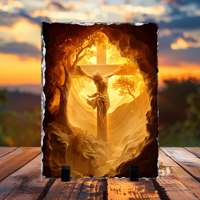 Această placă decorativă din ardezie naturală este realizată prin tehnologia de sublimare, care oferă imagini clare, culori intense și detalii deosebite. Designul religios aduce o notă de spiritualitate și eleganță, transformând această piesă într-un obiect decorativ special pentru orice locuință.
