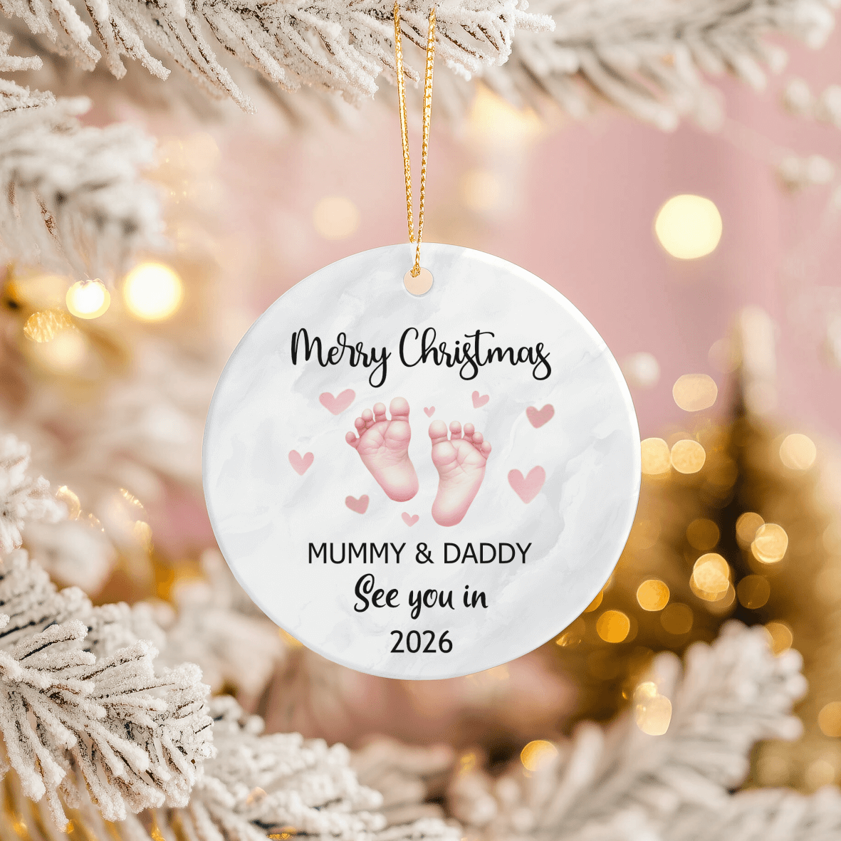 Personalizat pentru viitorii părinți, cu tematică fetiță, acest ornament sărbătorește cu bucurie așteptarea micuței și adaugă magie bradului de Crăciun.
